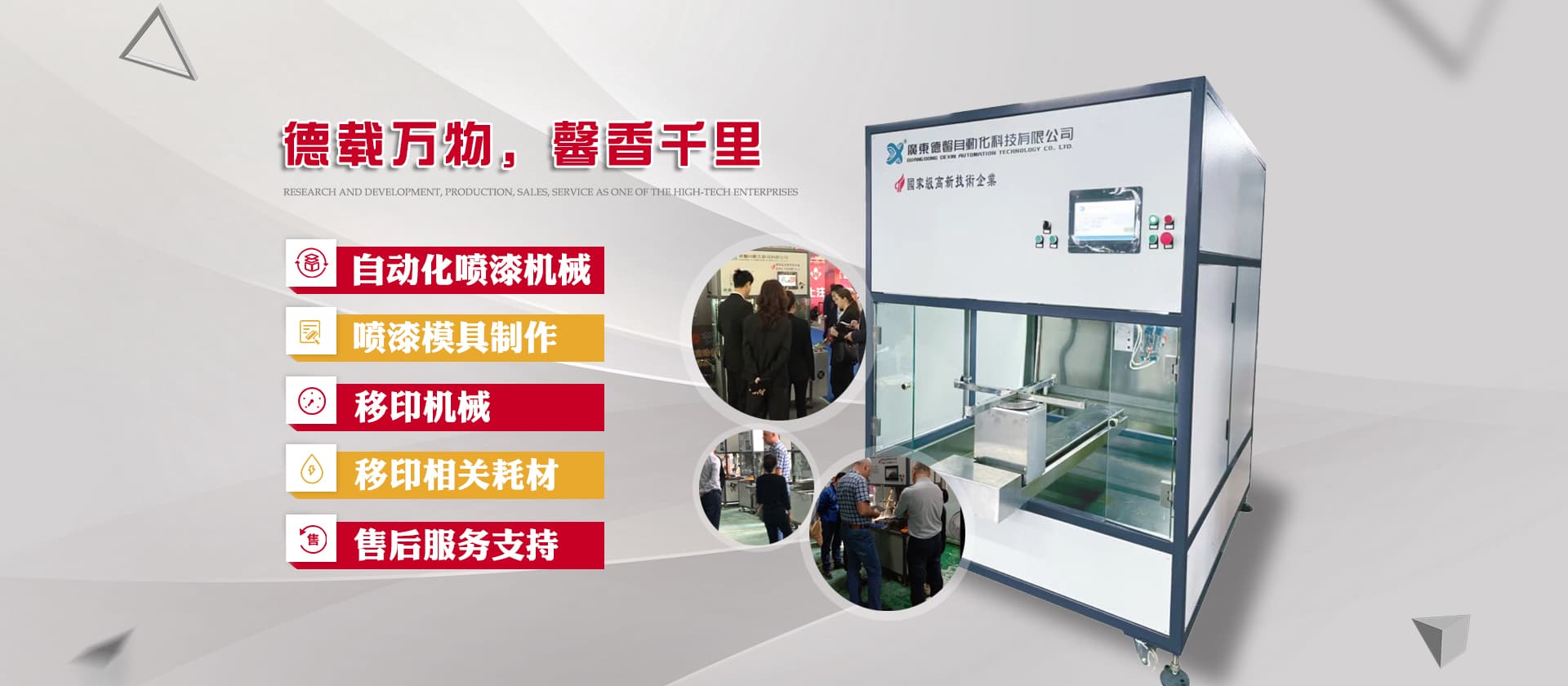 德馨科技創(chuàng)立以來,以改變噴印業(yè)傳統(tǒng)手工生產(chǎn)模式為目標(biāo),產(chǎn)品開發(fā)制造堅持以“環(huán)保、智能”為理念,為企業(yè)的生產(chǎn)環(huán)境、人力成本、生產(chǎn)效率等提供更為優(yōu)良的服務(wù)和技術(shù)支持。公司研發(fā)產(chǎn)品主要有自動化噴漆機(jī)械、噴漆模具制作等;生產(chǎn)銷售移印機(jī)械及移印相關(guān)耗材,包括菲林設(shè)計輸出;鋼板制作、移印膠頭制作、定位制作及周邊配件耗材并提供完善的售后服務(wù)支持。